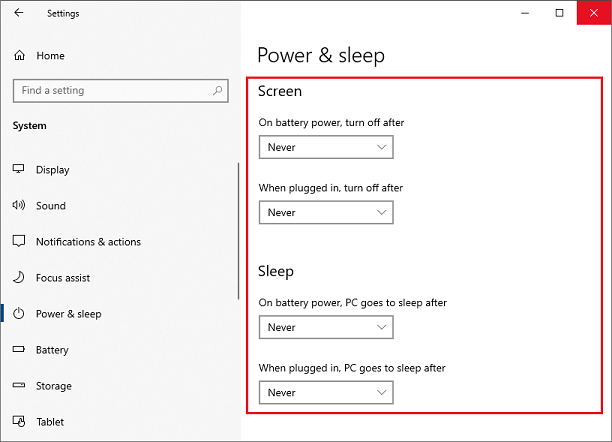 5. Check the "Display" and "Sleep" settings, then click the "Close (x)" button.