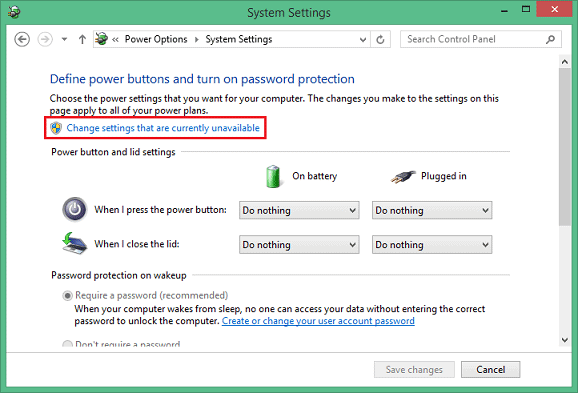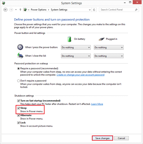 8. When the "Shutdown settings" item appears, check "Sleep" and click the "Save changes" button.