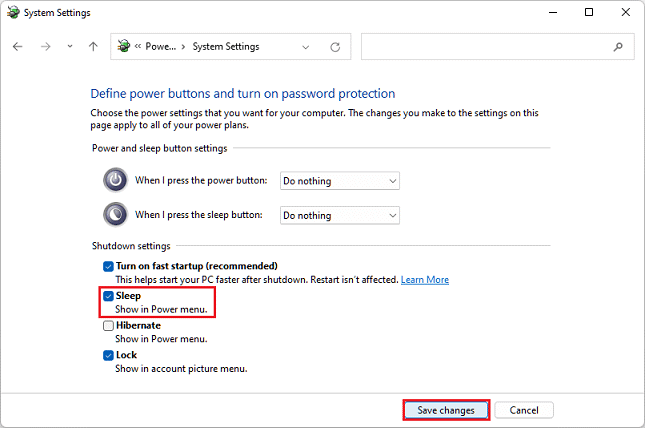 7. Check "Sleep" and click the "Save Changes" button.