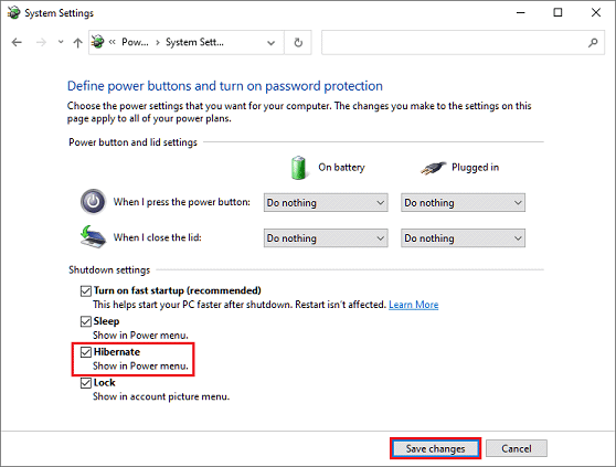 9. Under "Shutdown settings," check "Hibernate" and click the "Save changes" button.