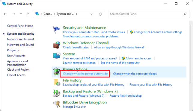 5. When the "System and Security" screen appears, click "Change what the power buttons do."
